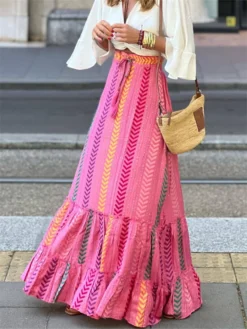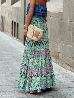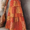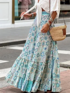 Printed, boho style, flowy ruffle hem, comfortable waistband and tassel drawstring design, ankle length, casual summer skirt, bohemian skirt for women to add a touch of elegance to your outfit.