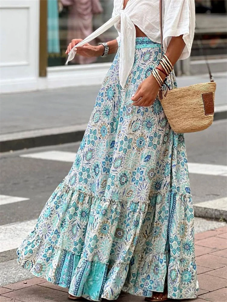 Women Flowy Boho Skirt Printed Ruffled Hem Summer Casual Skirt for Beach Vacation Club Streetwear Aesthetic Clothes