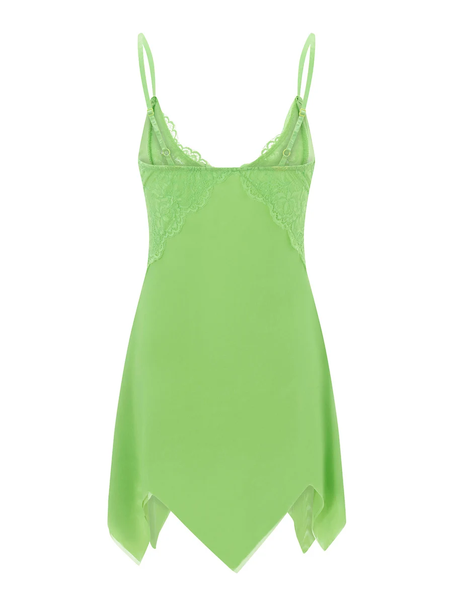 Women Lace Nightdress Lingerie Mesh See-Through V-Neck Sleeveless Sling Sleepwear Dress Irregular Hem Backless Underwear