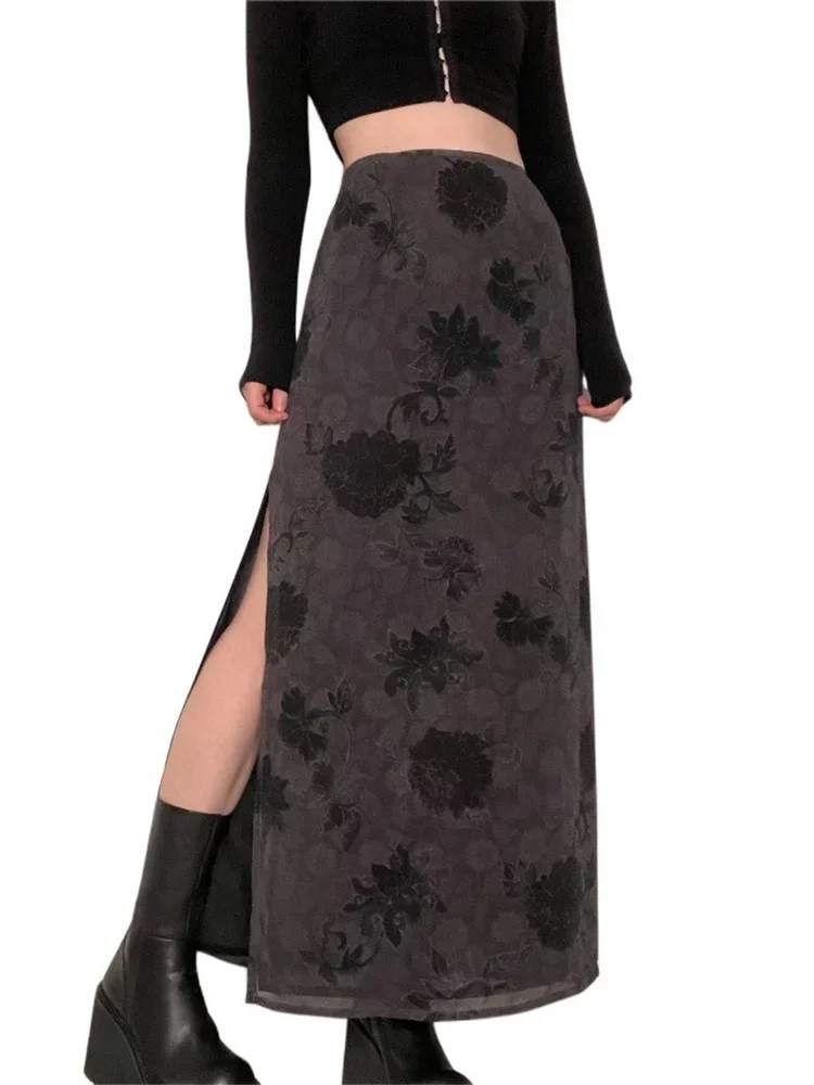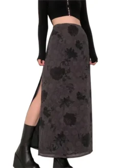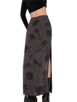 Women’s Retro Side Slit Skirt, High Waist Flower Print Ankle Length Skirt for Spring Autumn