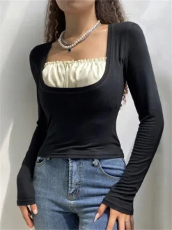 Women Shirts Fake-2-Piece Long Sleeve Square Neck Tops Autumn Gothic Grunge Y2K Aesthetic T-shirt Streetwear
