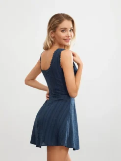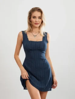 Womens Summer Tank Dress Sleeveless Square Neck Lace Trim Solid Color A-line Dress Short Mini Dress