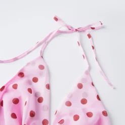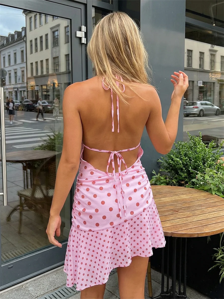 Women’s Dot Halter Mini Dress Summer Fashionable Cowl Neck Sleeveless Backless Ruffle Hem Dress
