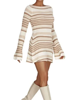 Women’s Fall Mini Dress Long Sleeve Open Back Contrast/Solid Color Knit Dress Casual Sweater Dress