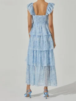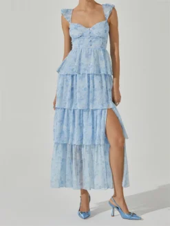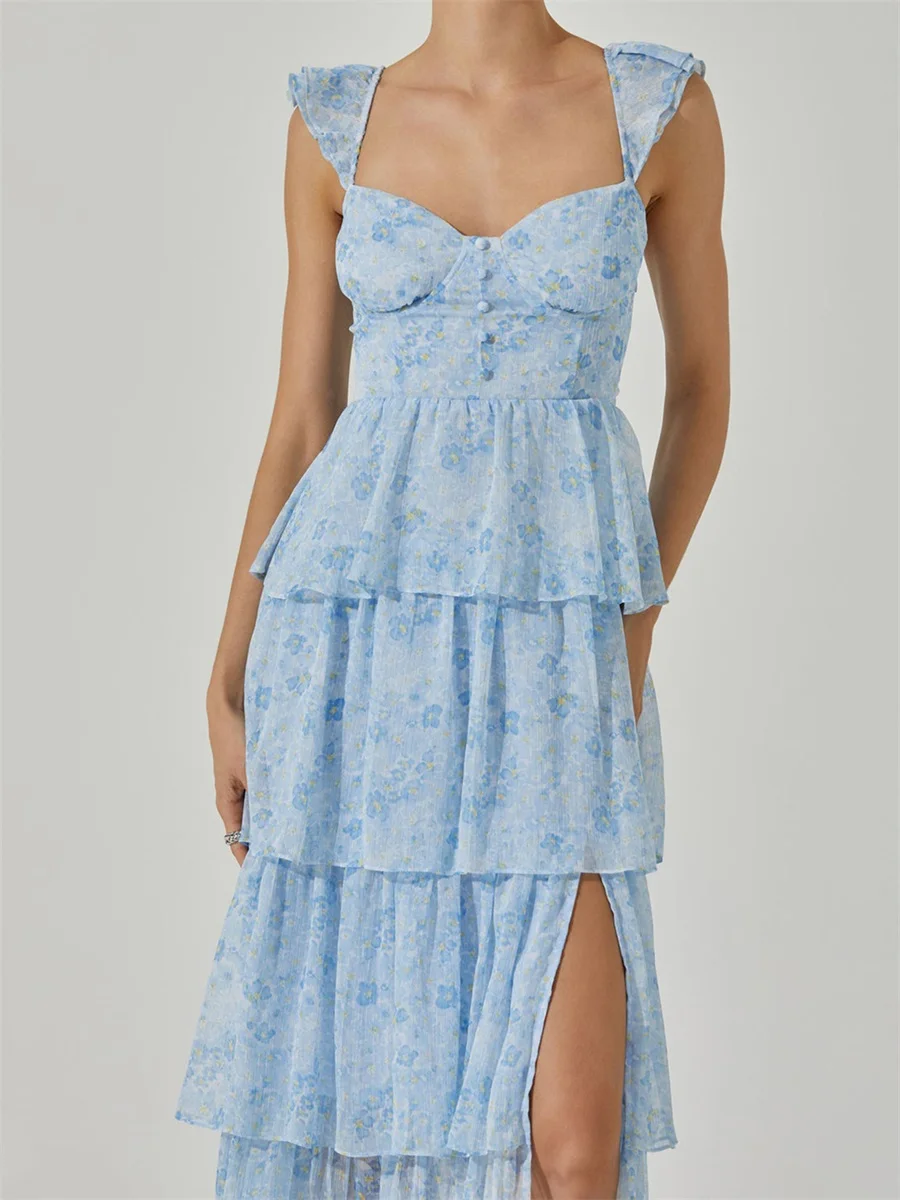 Women's Floral Dress Stylish Multi-Layered Ruffles Split Cap Sleeve Long A-Line Dress for Spring& Summer