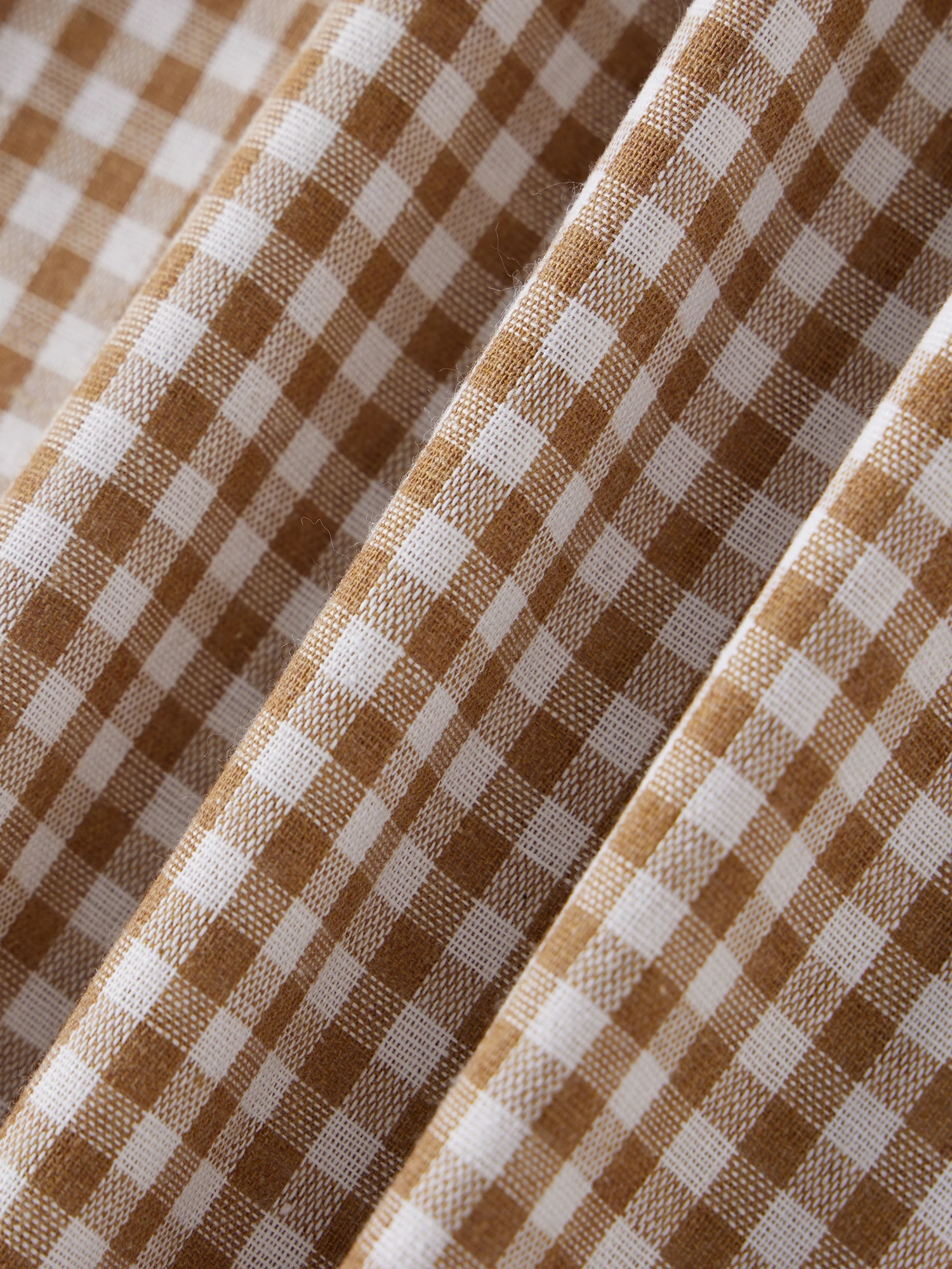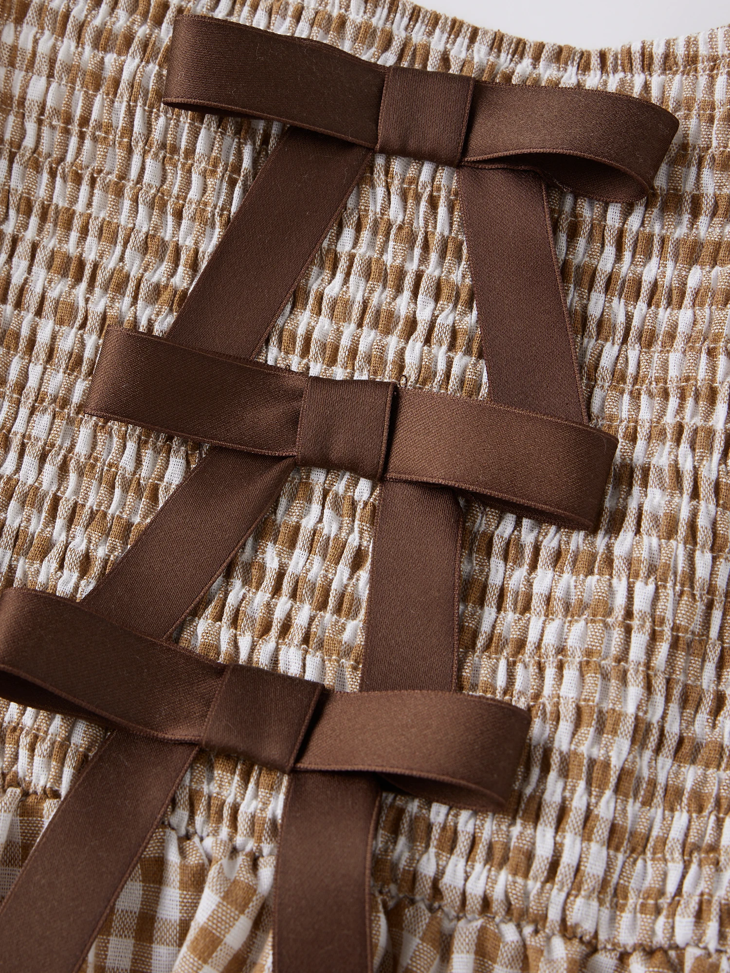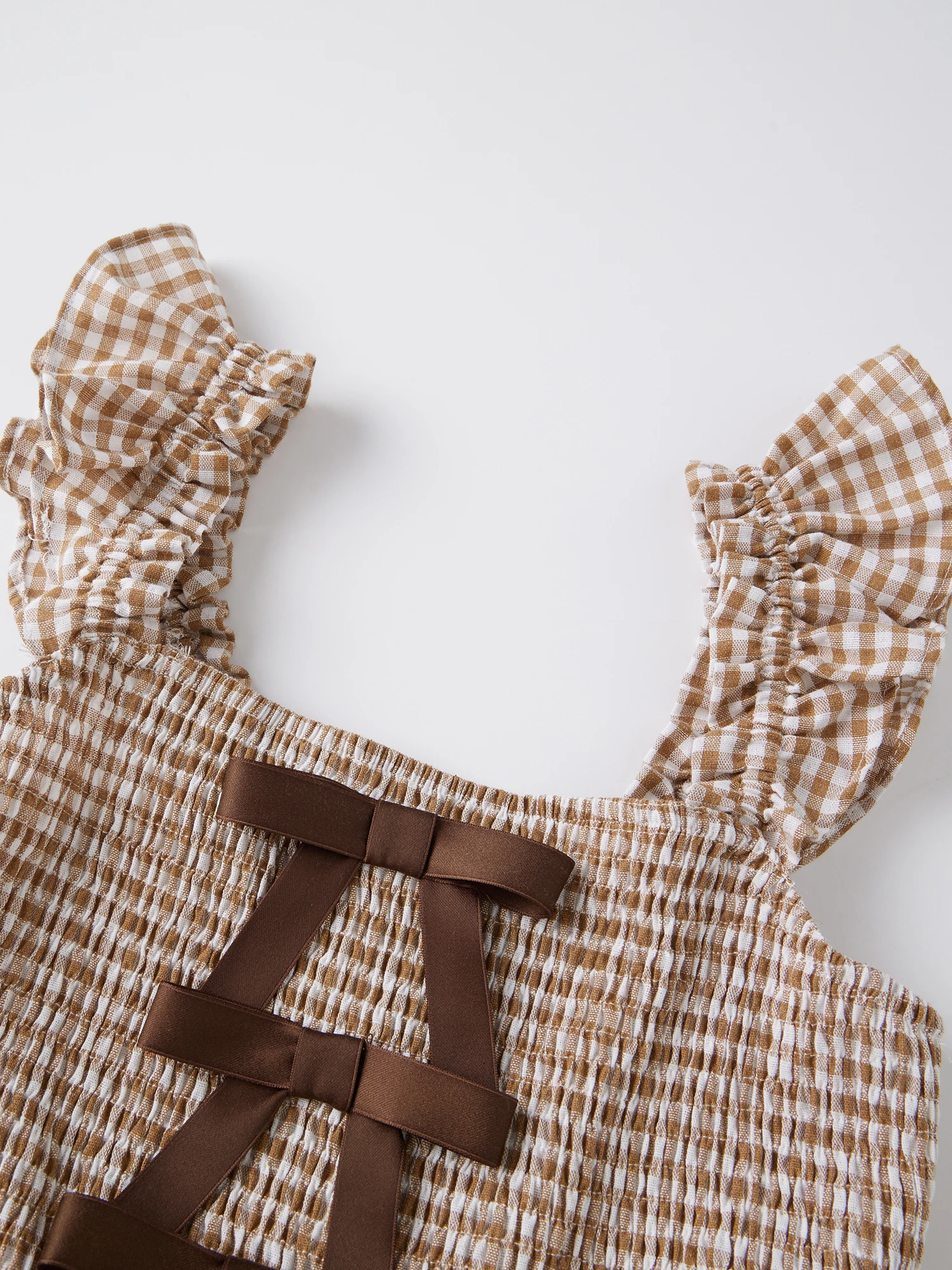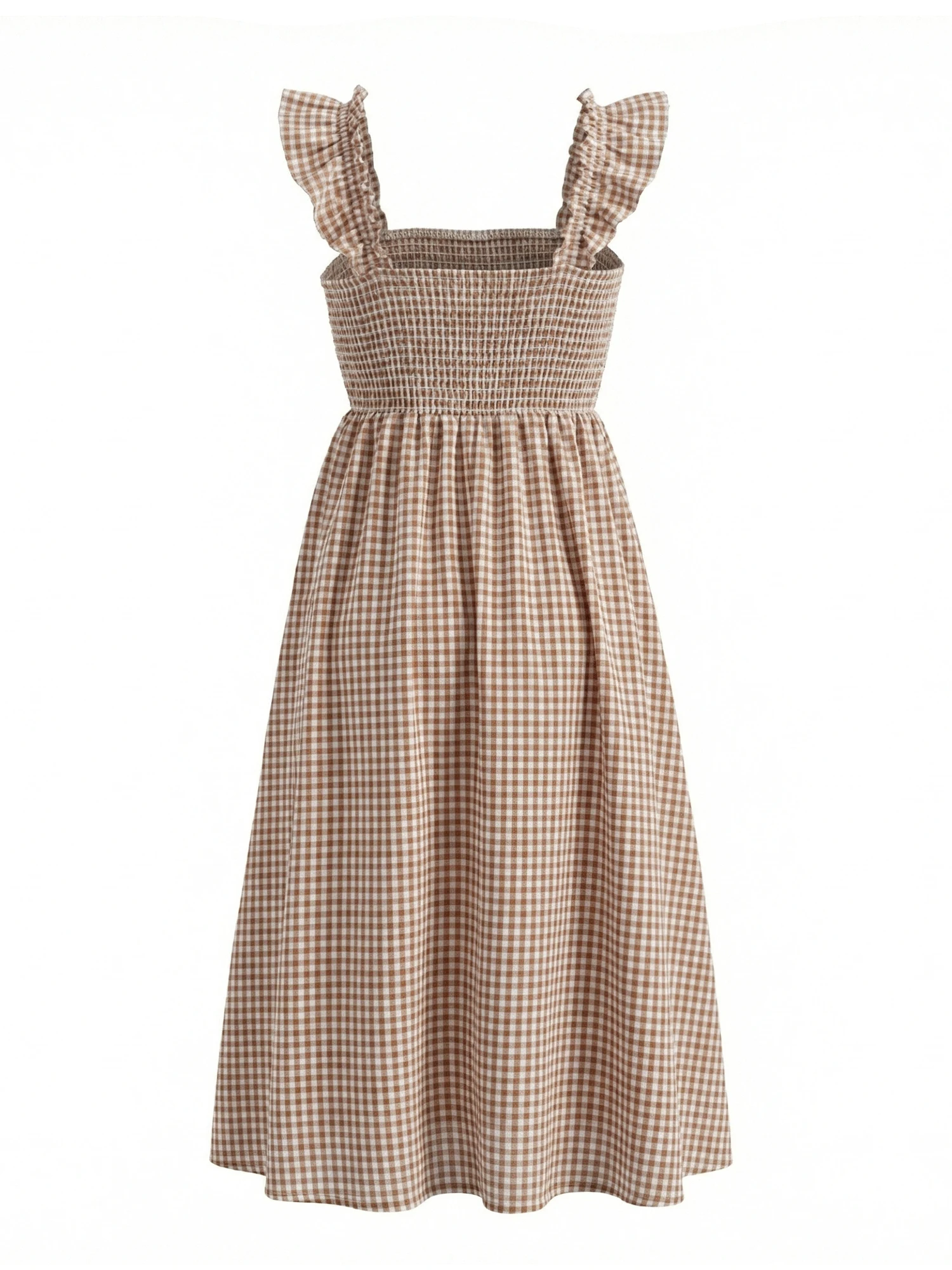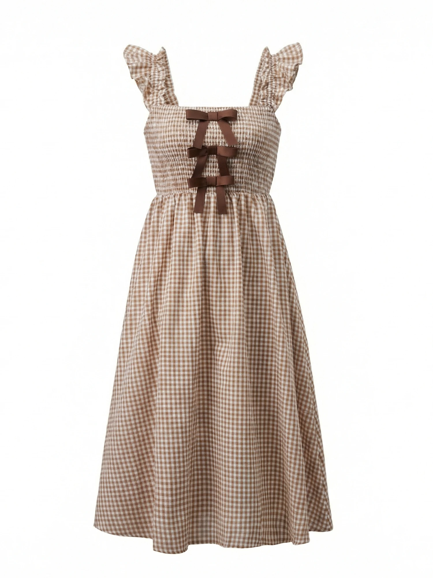 Women’s Plaid Dress Stylish Decorative Bow Smocked Ruffled Trim Flying Sleeve Long A-Line Dress