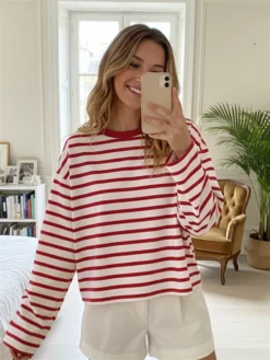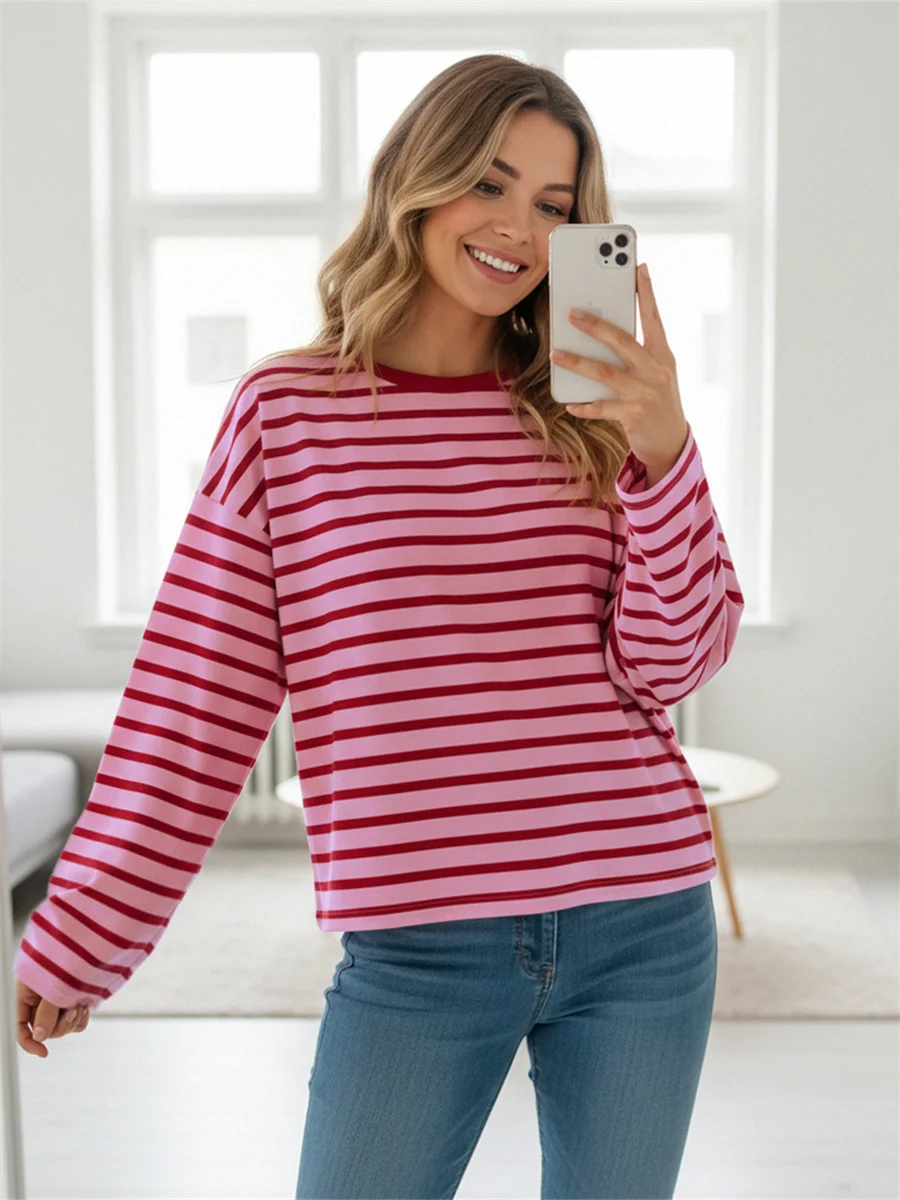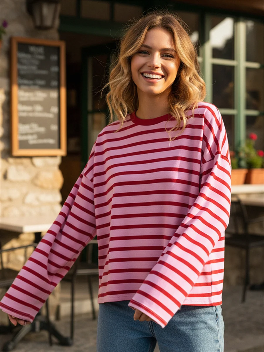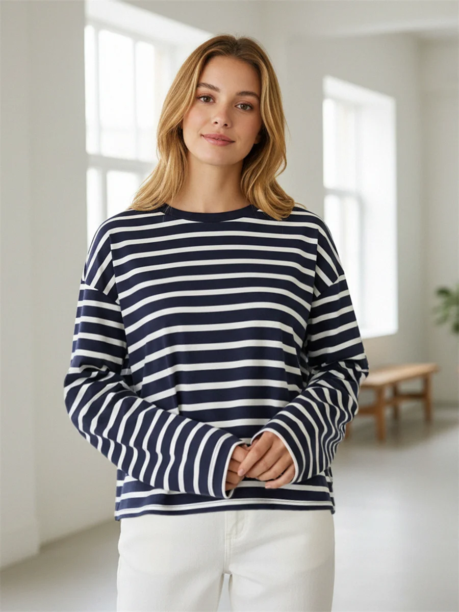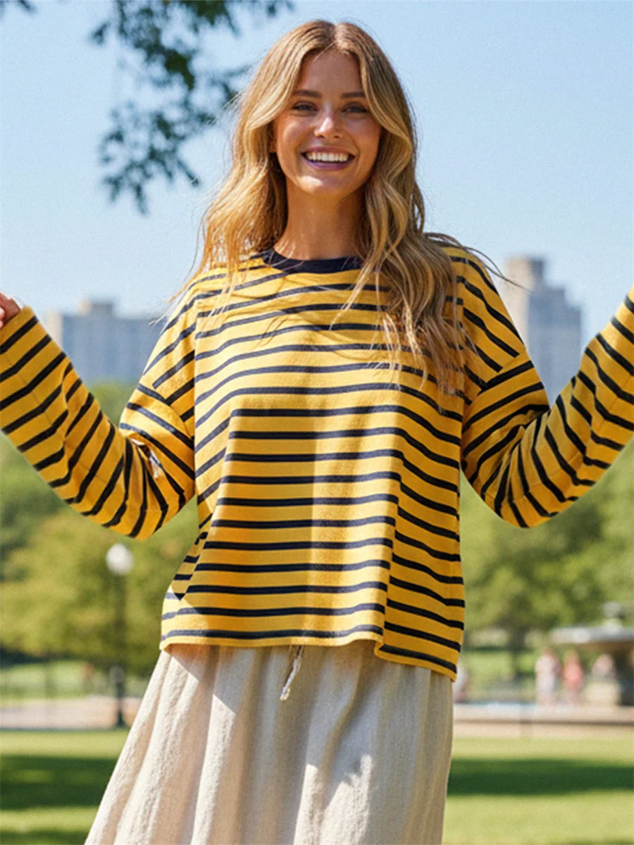 Womens Loose Tunic Tops Long Sleeve Round Neck Stripes Print T-Shirts Spring Summer Blouses