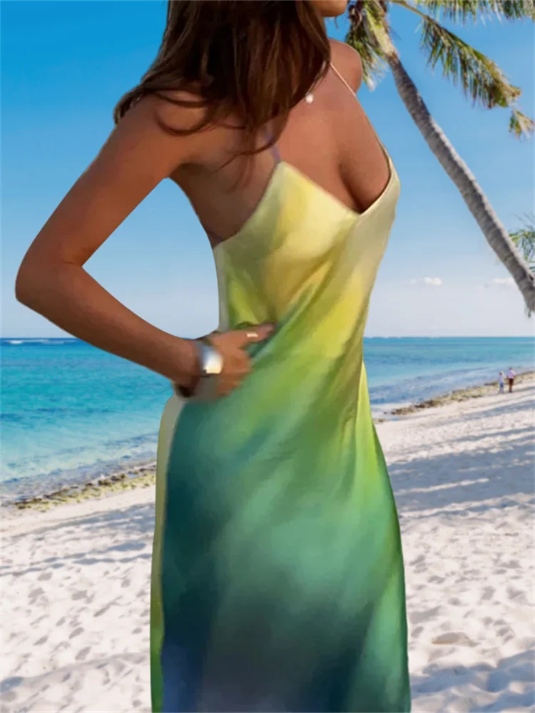 Women’s Summer Cami Long Dress Gradient Color Spaghetti Strap V-Neck Backless Beach Party Dress